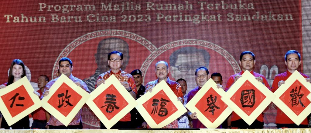 Ketua Menteri, Datuk Seri Hajiji Haji Noor (tengah) bersama Pengerusi DAP Sabah, Datuk Frankie Poon menunjukkan kaligrafi cina yang mereka tulis sempena Majlis Rumah Terbuka Tahun Baharu Cina 2023 Peringkat Sandakan di Dewan Hakka Sandakan, Sandakan, hari ini. Turut hadir, Timbalan Ketua Menteri I, Datuk Dr. Jeffery Kitingan dan Timbalan Ketua Menteri III, Datuk Ir. Shahelmey Yahya.