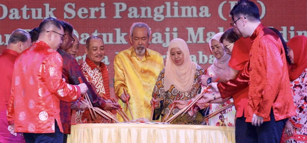 Ketua Menteri, Datuk Seri Hajiji Haji Noor mengiringi Tuan Yang Terutama Tun Juhar Mahiruddin ketika memukul gendang sebagai tanda rasminya Majlis Santapan Tahun Baharu Cina bersama Tuan Yang Terutama Tun Juhar Mahiruddin, Yang di-Pertua Negeri Sabah di Port View Palace Hall Tanjung Lipat, Kota Kinabalu.
