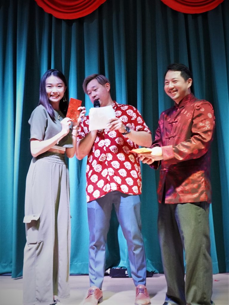 沙巴亞庇(彭城)劉氏宗親會青年團團長劉雲善移交紅包予遊戲獲獎者。