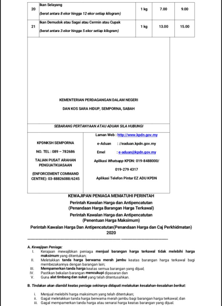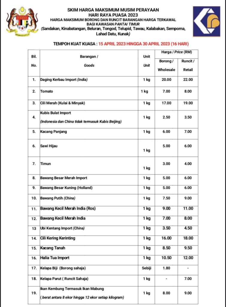 東海岸地區(山打根、京那巴登岸、比魯蘭、東谷、都魯必、斗湖、卡拉巴干、仙本那、拿篤、古納)統制品頂價