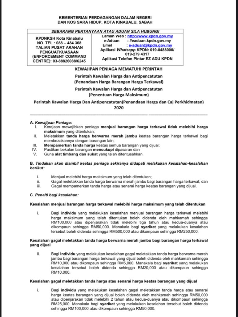 西海岸地區(亞庇、兵南邦、吧巴、必打丹、斗亞蘭、古打毛律、蘭瑙、保佛、實必丹、瓜拉班尤、古達、哥打馬魯都、必達士、根地咬、丹南、擔布南、納巴灣)統制品頂價