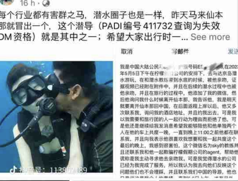 Pelancong China berusia 25 tahun membuat laporan polis didakwa telah dicium oleh pembantu jurulatih selaman semasa melakukan aktiviti selam skuba pada 5 Mei lalu dan mangsa membuat laporan polis pada 6 Mei sebelum bergerak ke Lapangan Terbang Tawau.