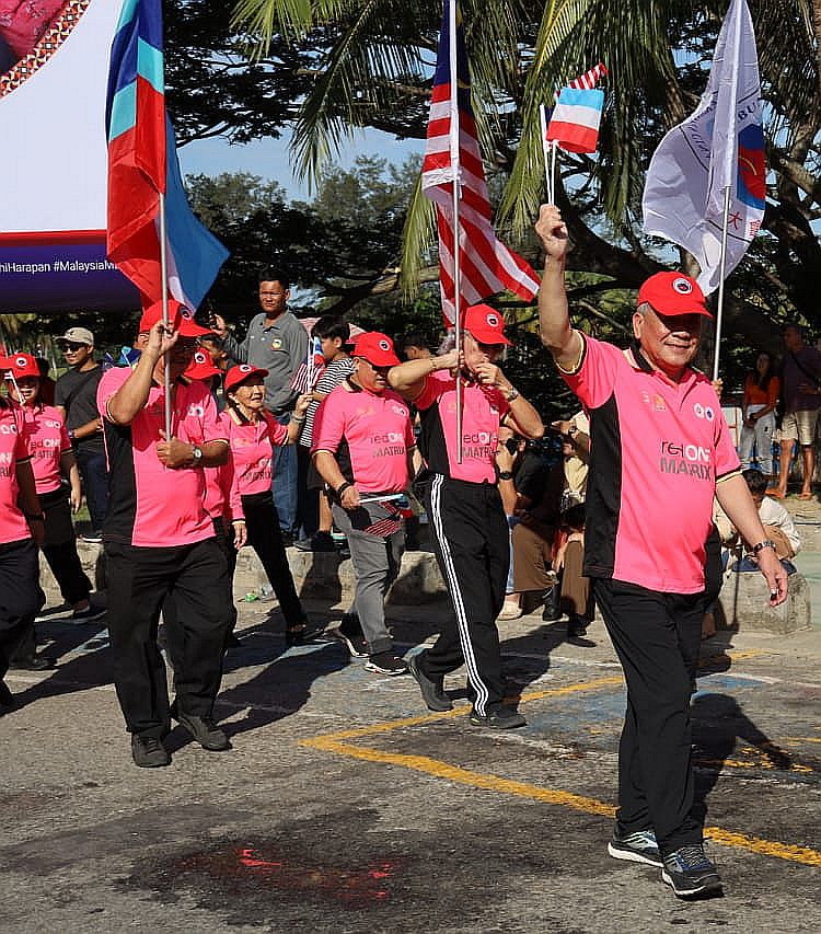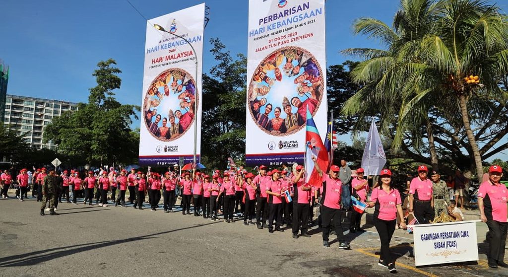 丹斯里吳添泉(右)手持國、州旗率領華堂隊伍參與沙巴州級國慶大遊行。