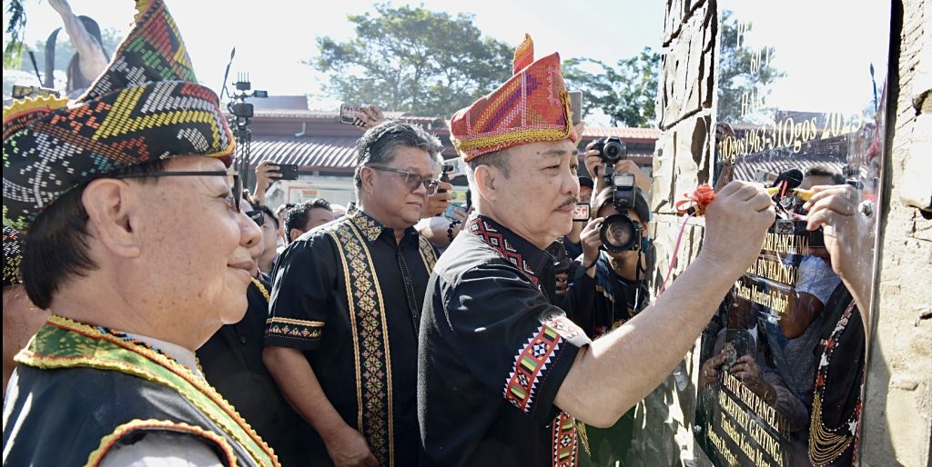 Hajiji diiringi oleh Timbalan Ketua Menteri I merangkap Menteri Pertanian, Perikanan dan Industri Makanan (MAFFI), Datuk Seri Dr Jeffrey Kitingan menandatangani Tugu Peringatan 60 Tahun Hari Sabah Merdeka di Pisompuruan Square, Tambunan