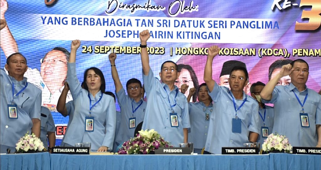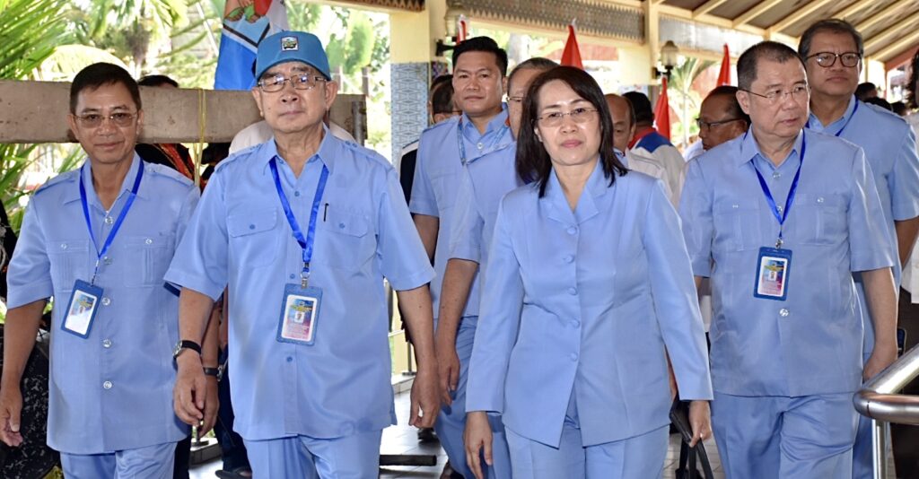 Dr. Maximus Ongkili (tengah) diiringi Dr. Joachim (kiri), Timbalan Presiden PBS, Datuk Seri Dr. Yee Moh Chai (kanan), Setiausaha Agung PBS, Datuk Julita Majungki san pemimpin lain memasuki Dewan Hongkod Koisaan KDCA.