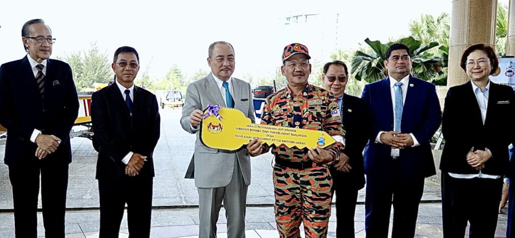 Hajiji menyampaikan kunci bot kepada Penolong Pengarah (Operasi) Jabatan Bomba dan Penyelamat Negeri Sabah, Hamsa Isnurdini.