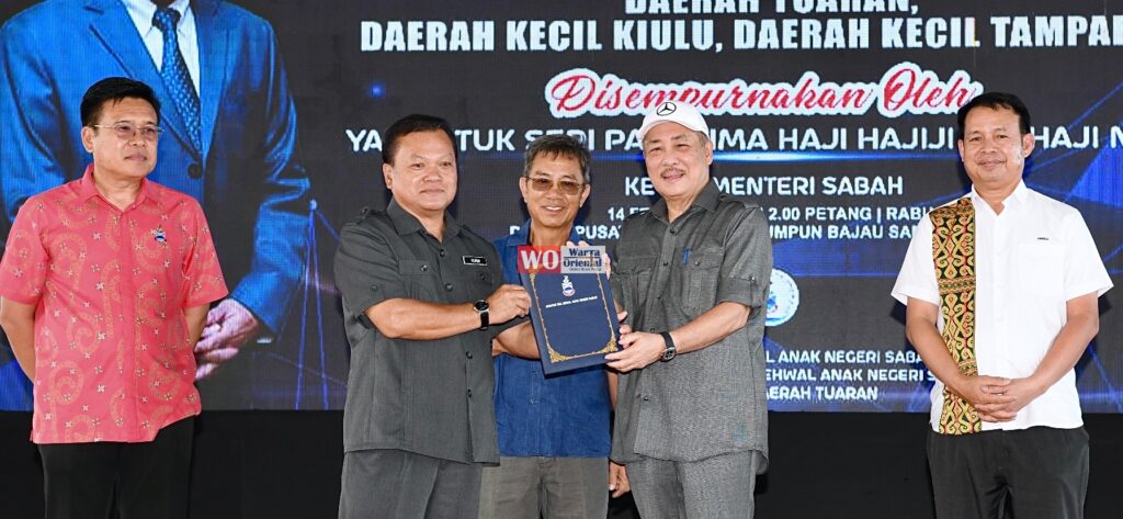 Hajiji (dua kanan) menyampaikan sijil kepada Ketua Daerah Kiulu OKK Kumin Gampai.