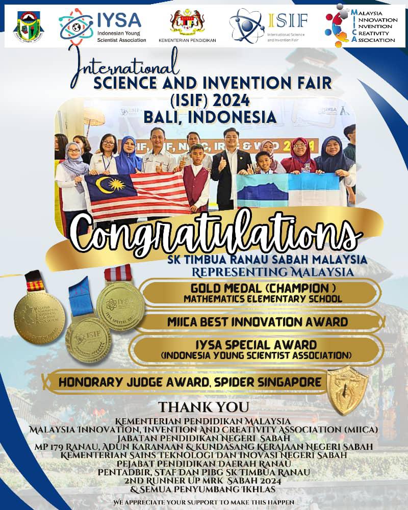 RANAU: A student-teacher team from Sekolah Kebangsaan (SK) Timbua here has made Malaysia proud by securing four prestigious awards at the recently-concluded International Science and Invention Fair (ISIF) 2024 held in Bali, Indonesia.
