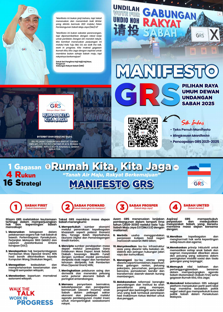KOTA KINABALU: Gabungan Rakyat Sabah (GRS) today launched its Manifesto for the 17th Sabah State Legislative Assembly Election, outlining one vision, four pillars and 16 comprehensive development strategies charting Sabah’s direction for the next five years.