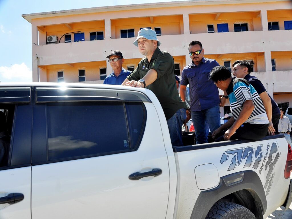 Jamawi menaiki kenderaan pacuan empat roda bagi membuat pemantauan di kawasan penanaman padi Trusan Sapi.
